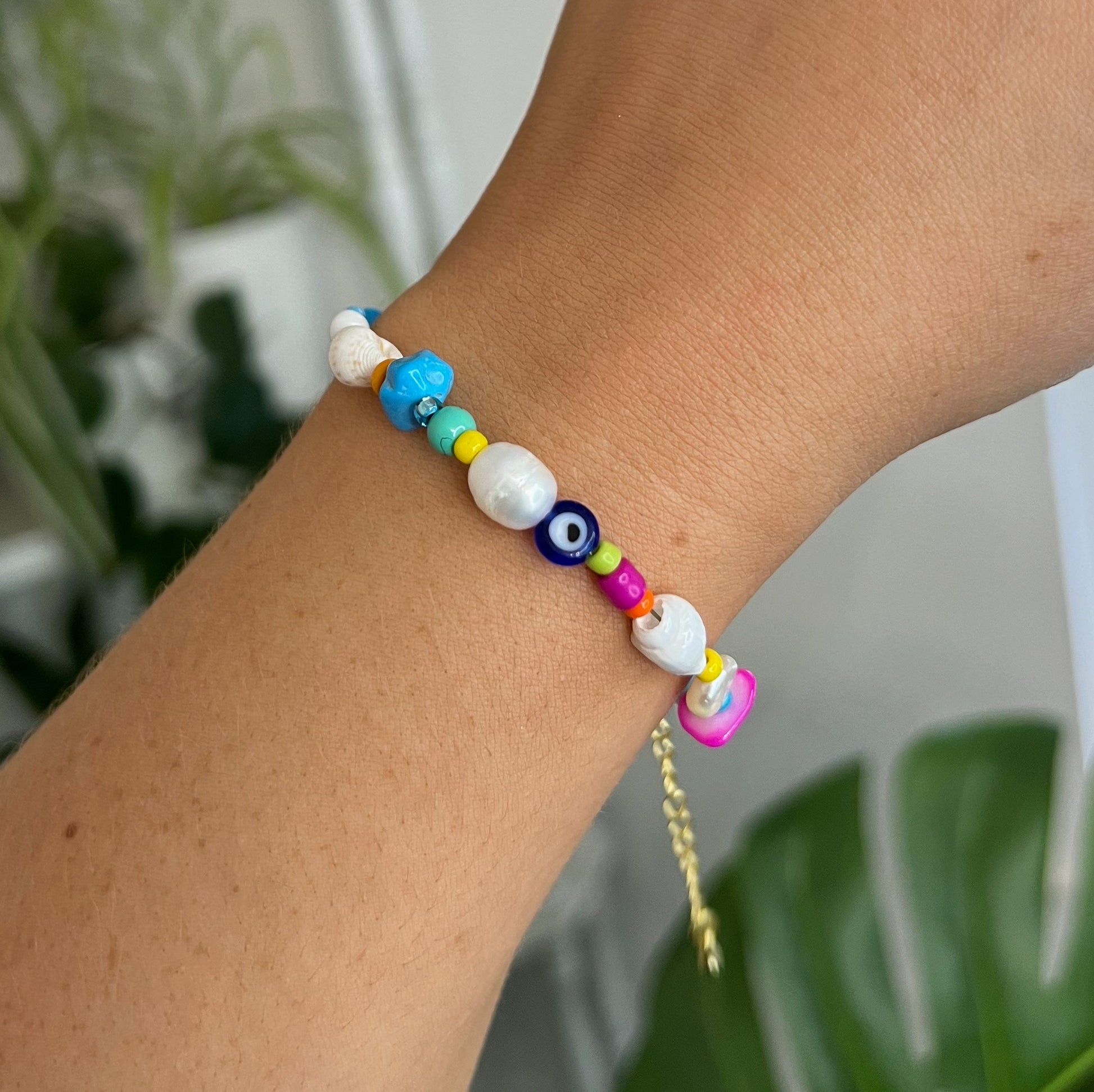 The Brighton Bracelet.. a bright mix of beads, shells & pearls. 6 inches long + a 2 inch extender chain.