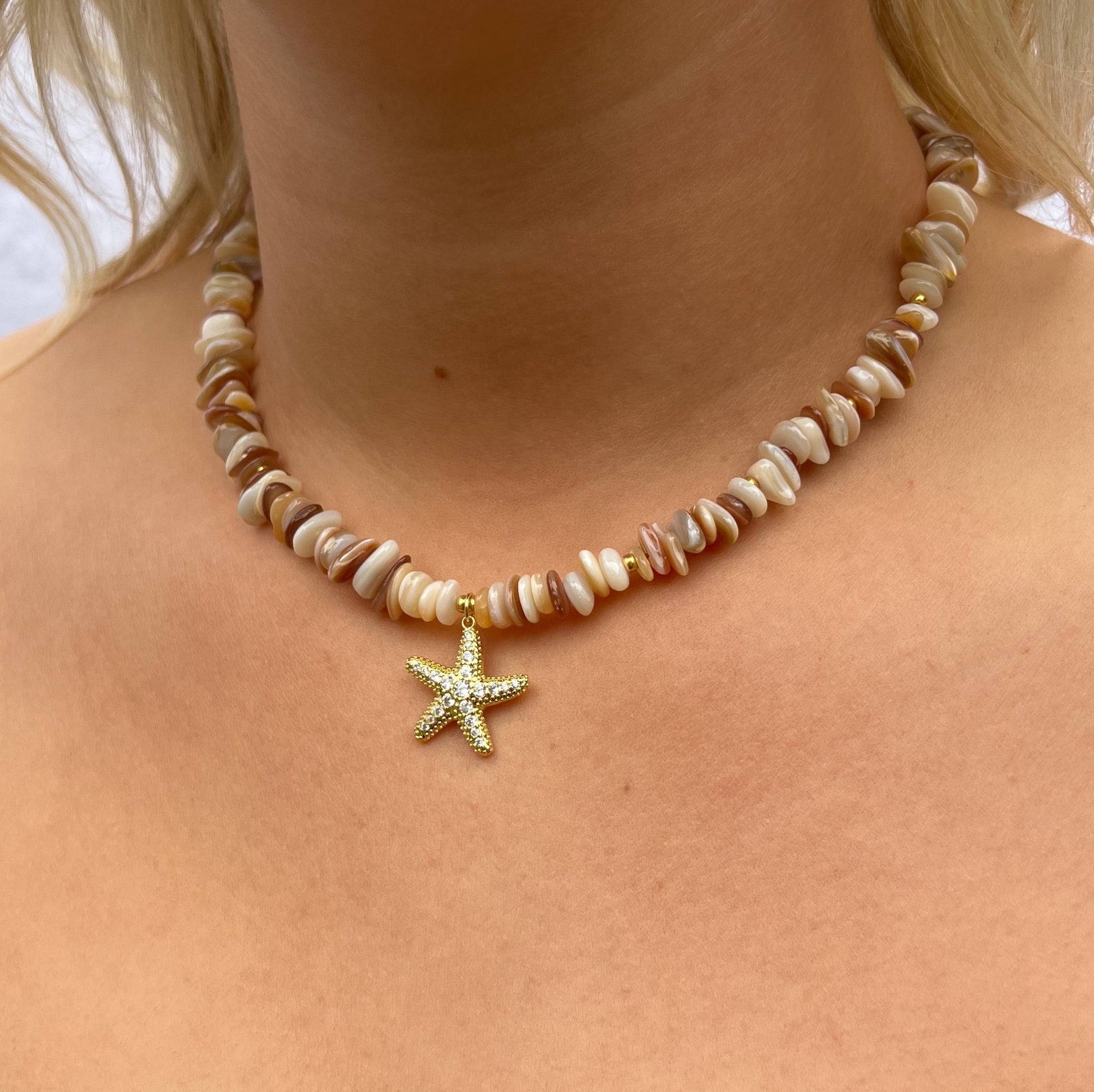 Shell chip beads with a 18k gold plated CZ starfish pendant