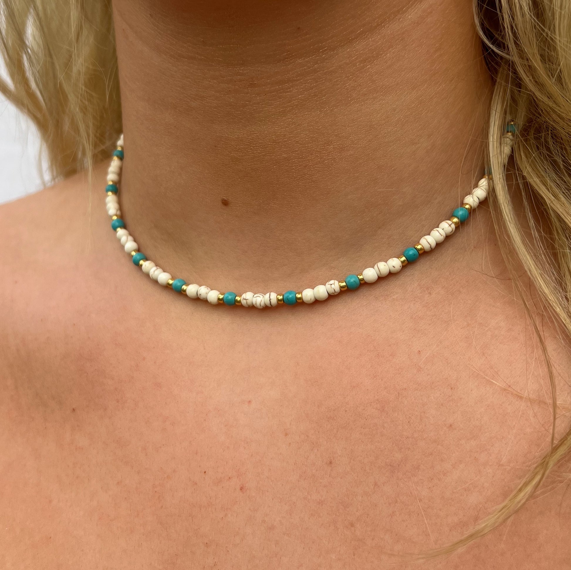 A mix of magnesite and turquoise stones - the ultimate beach necklace.