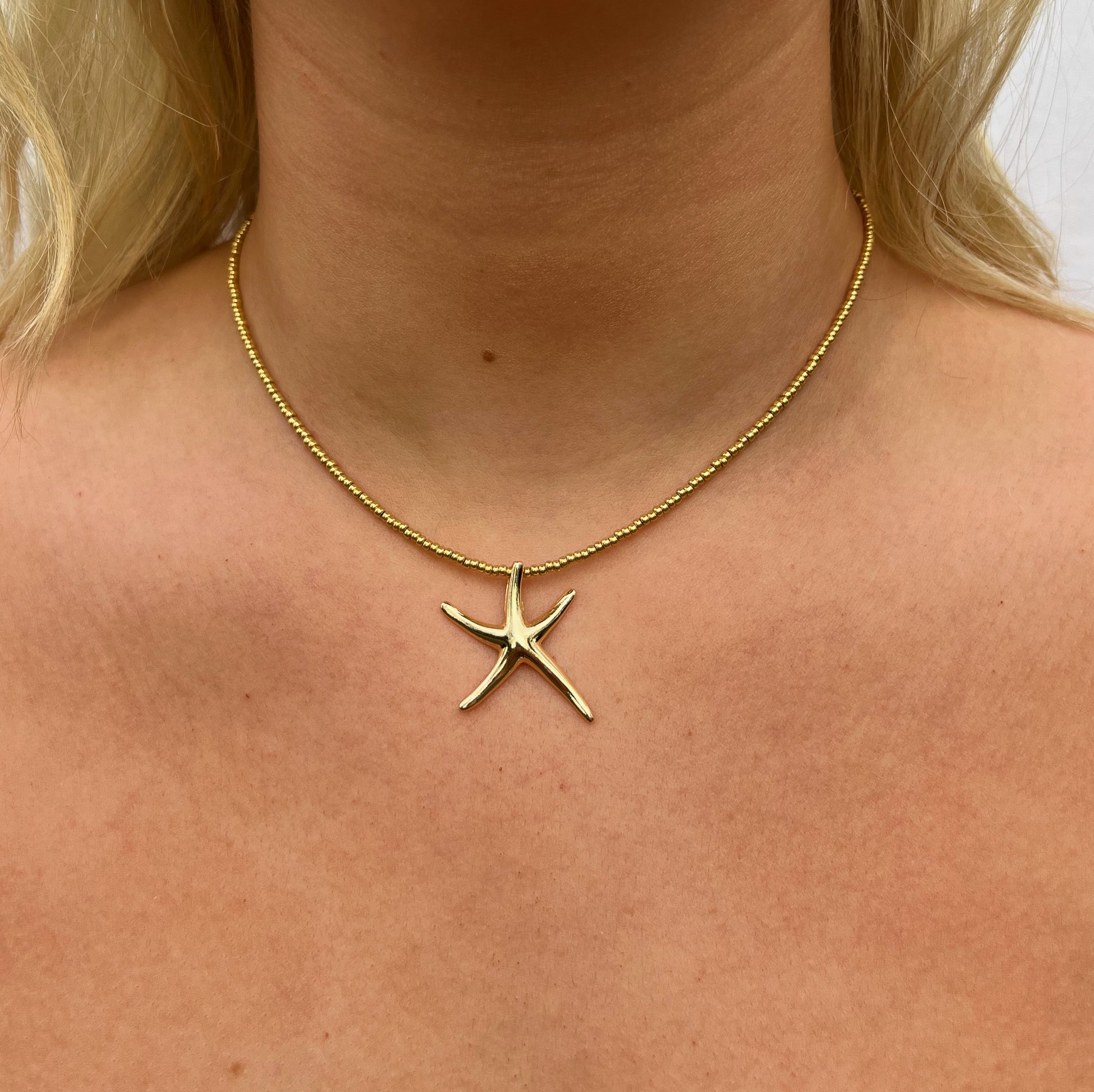 Chunky 18k gold plated starfish pendant on a dainty necklace made from golden Miyuki beads.