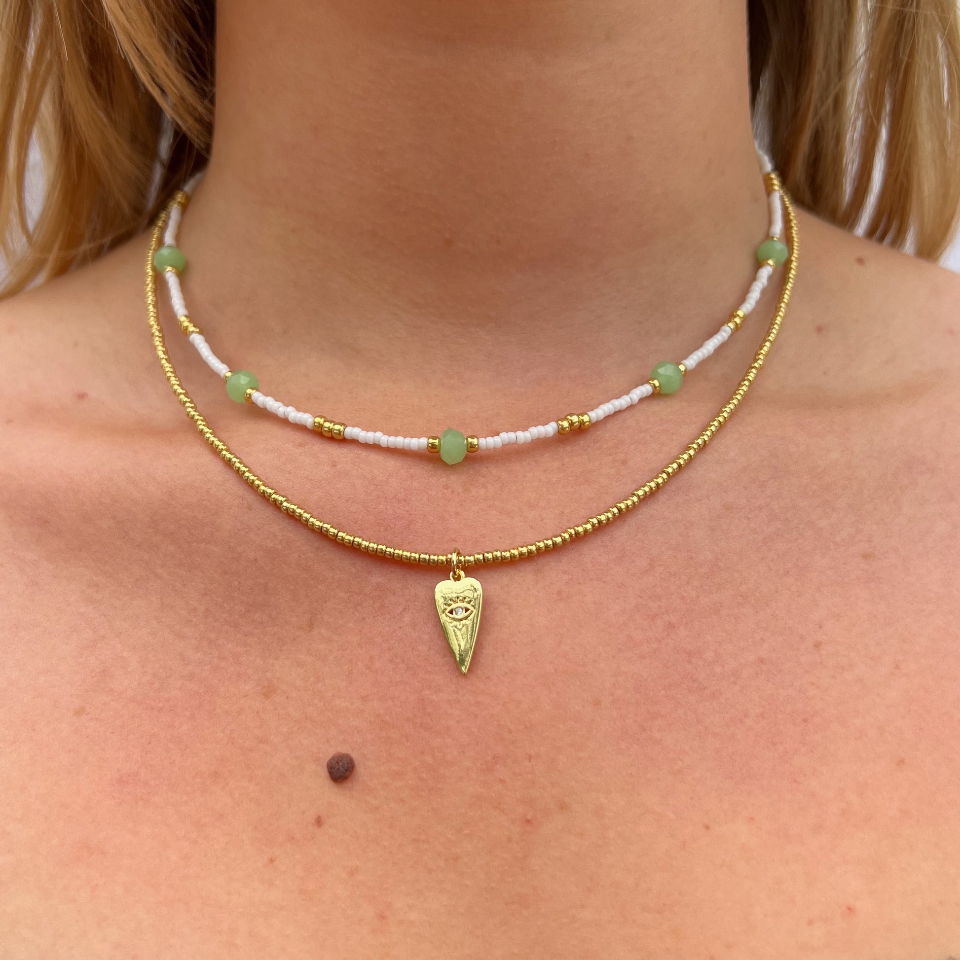 A dainty 18k gold plated heart pendant on a chain of golden seed beads.