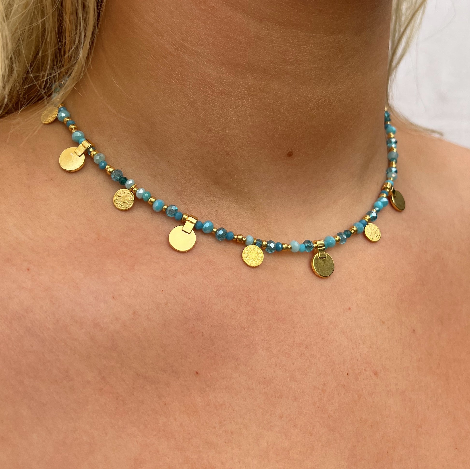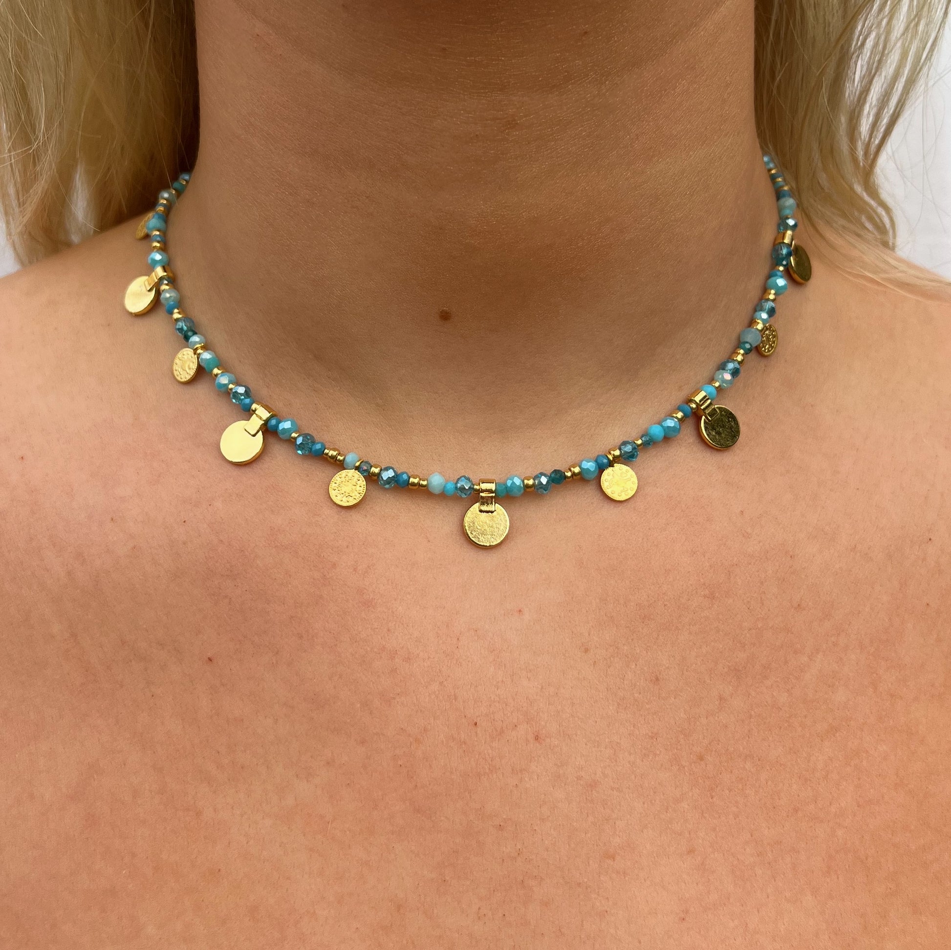 Beautiful blue crystal beads with gold coin charms - 15 inches long + 2 inch extender chain