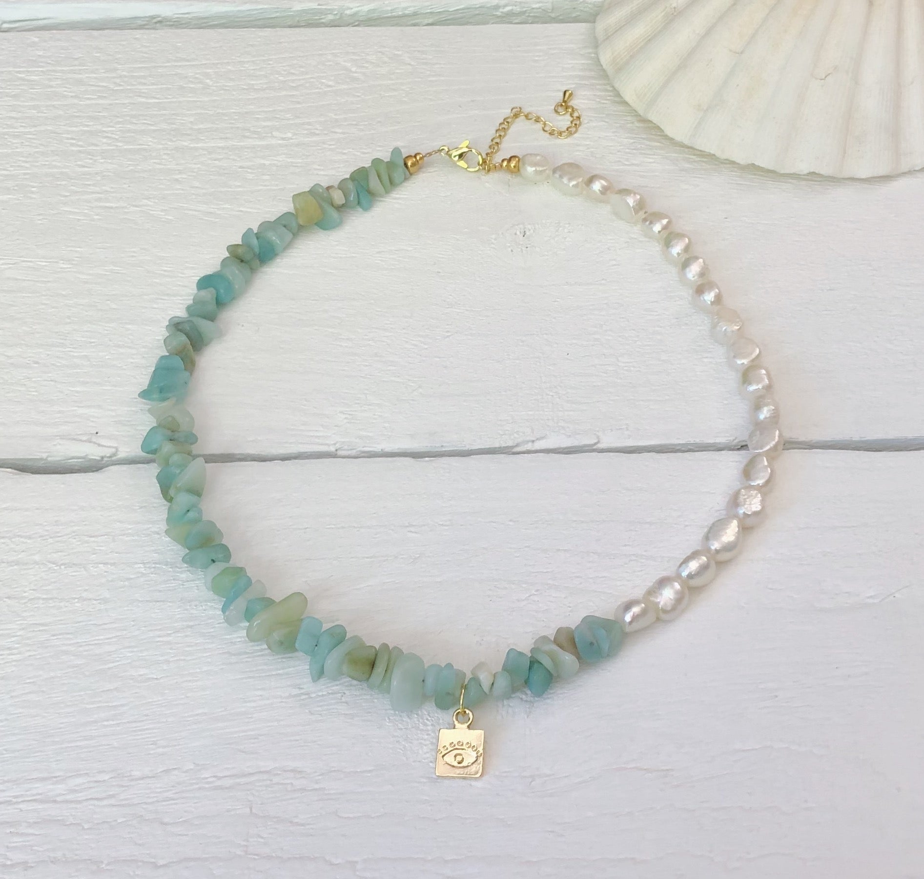 Our Paradiso necklace.. beautiful green amazonite chips with chunky freshwater pearls and a gorgeous 18k gold plated eye pendant.