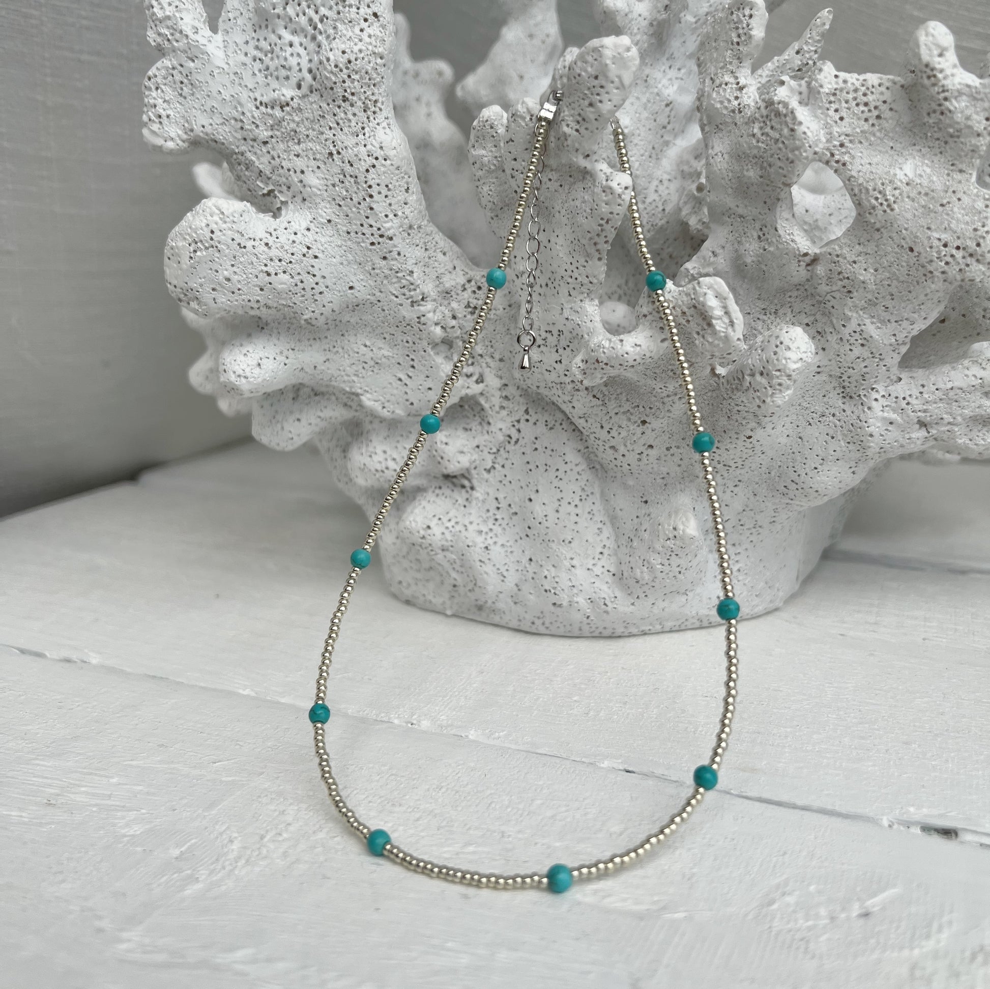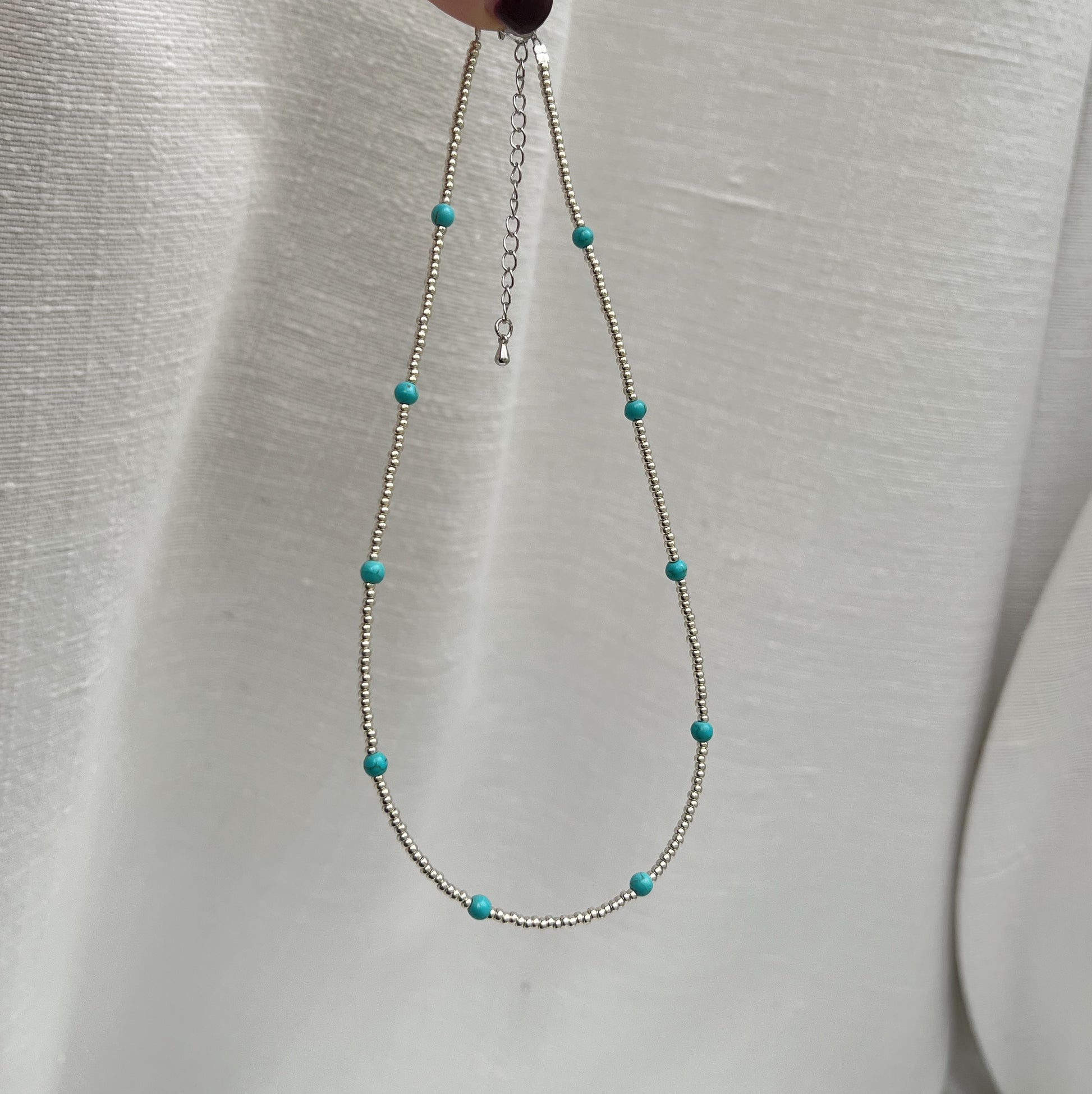 Dainty silver seed beads with 4mm turquoise beads.