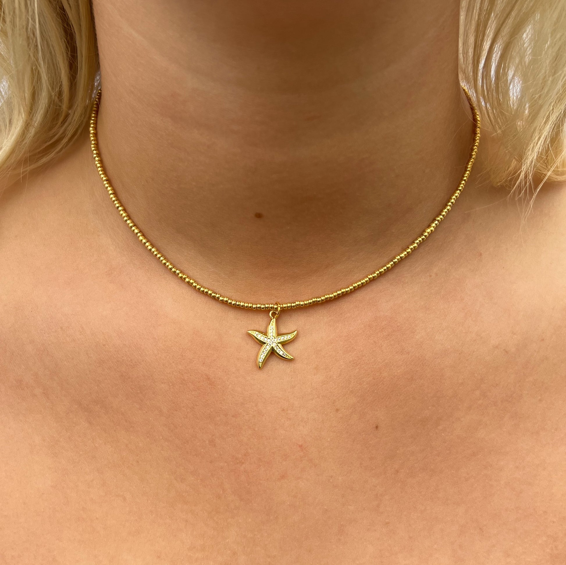 Gold plated CZ starfish pendant on a chain of golden seed beads