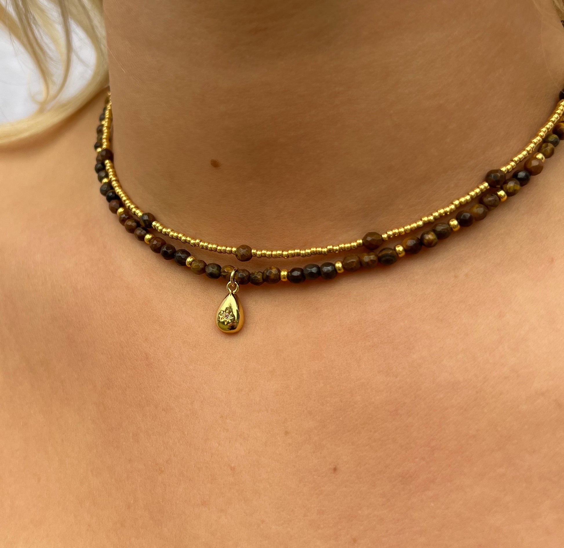 Tigers eye beads with a gold plated CZ charm